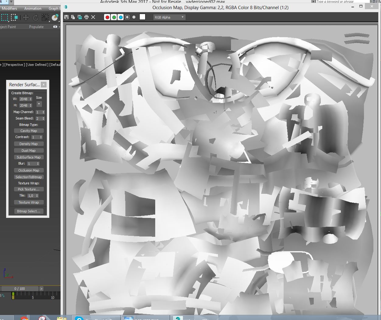 Este no es el caso porque el chibi es sencillo y además el color es todo negro. Aquí no tendremos muchos problemas. Pero aprovechamos para imaginar qué es lo que se podría hacer si tuvieramos que tener un espacio mucho mayor para muchas más piezas. ya no es práctico generar un mapa de 16000 pixels. Entonces se recurre a dividir el objeto en zonas de espacio UV. A este proceso se lo conoce como «mapping multi tile». En las versiones anteriores a la 2017 de MAX podemos decir que el soporte visual y de comandos para el «multi tile» no es muy útil. Pero esto afortunadamente ha cambiado.