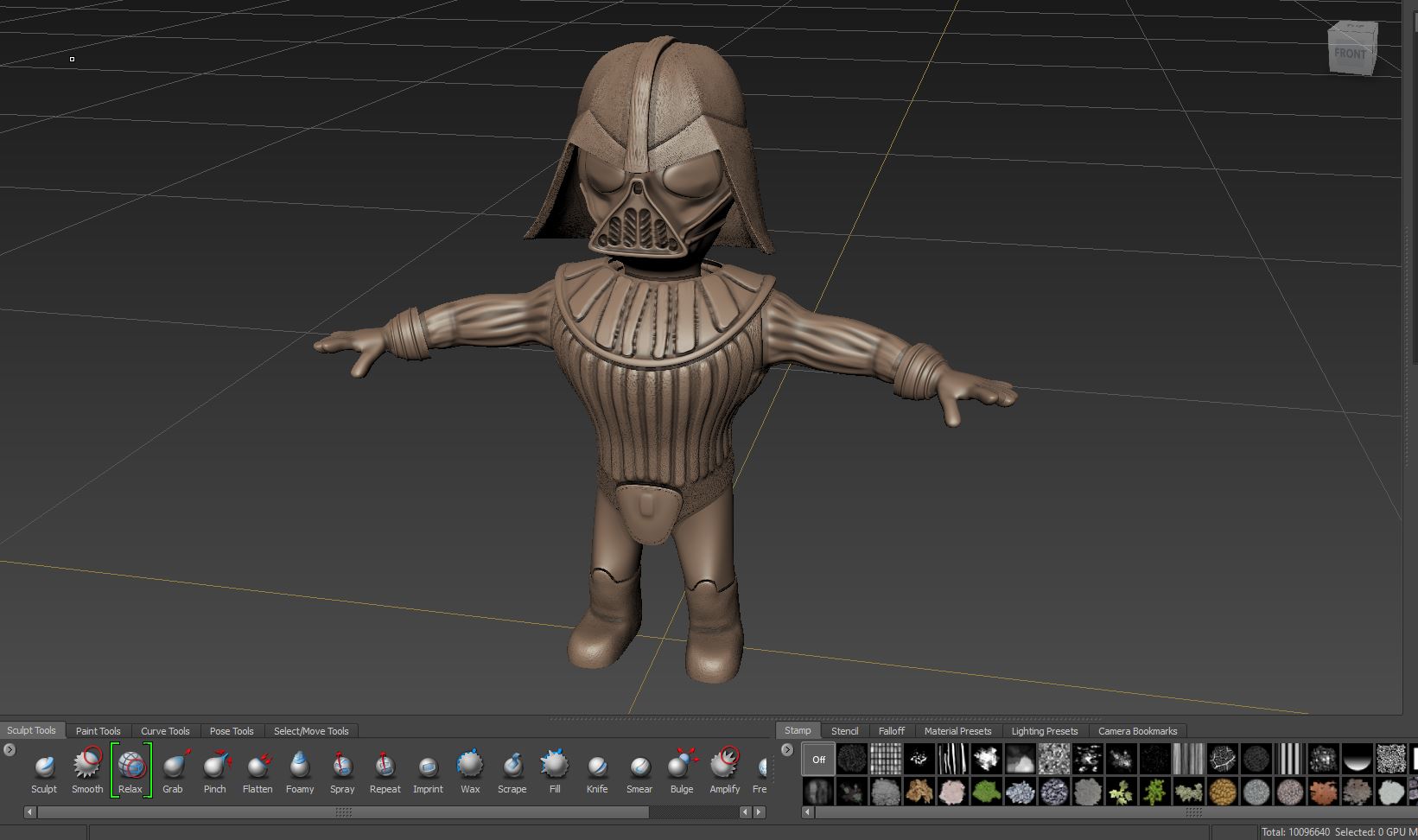 Y ahora viene la parte satisfactoria de un buen desplegado de UV. En la actualidad es raro el workflow que se apoye de forma exclusiva en un solo software. Nuestro mapping nos sirve para enviar al personaje a mudbox y crearle bastante más detalle del que tiene ahora y extaeremos ese detalle en mapas para que nuestro modelo no aumente de cantidad de polígonos, pero si se vea más vistoso.