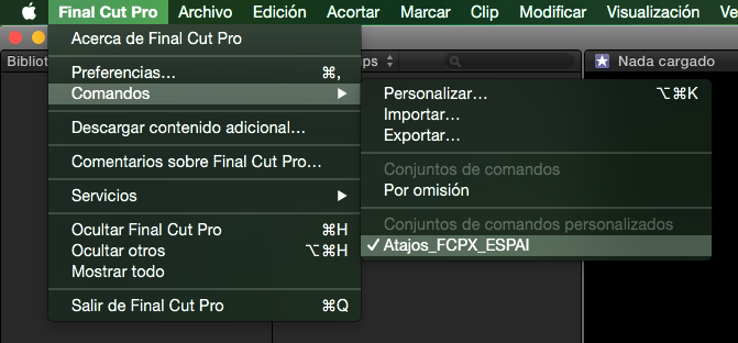 El último paso es volver al menú Final Cut Pro > Comandos y clicar sobre Atajos_FCPX_ESPAI, para que éste sea el conjunto de atajos activo y por tanto el que tendrá en cuenta Final Cut cuando se pulsen las teclas.