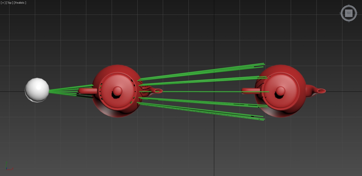 La tetera que se encuentre más cerca de la fuente de luz recibirá la mayoría o todos los rayos mientras que un objeto que se encuentre más alejado perderá algunos. En el ejemplo la segunda tetera recibe diez rayos menos de luz que la primera.