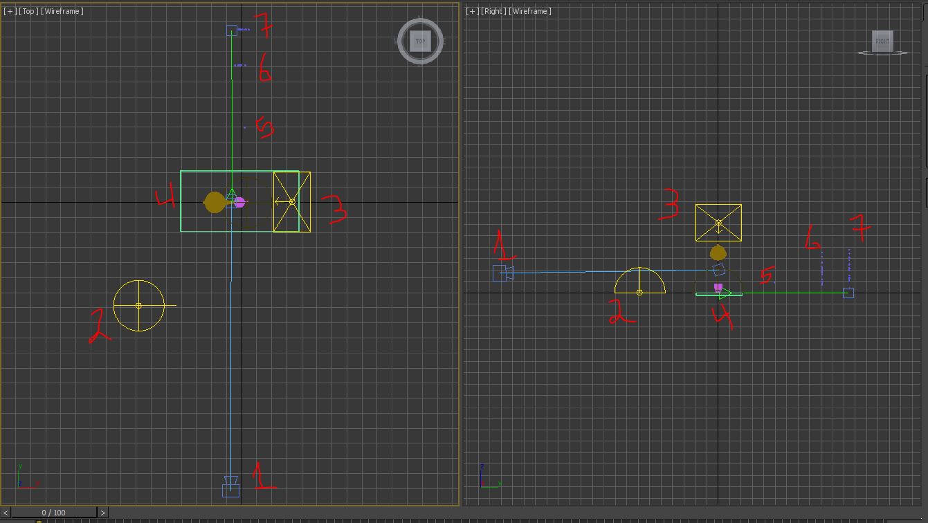 1.- La cámara a 1,92 mts del objetivo. 2.- Luz de vray domo para el ambiente 3.- Luz de vray plana para iluminar la escena principal. 4.- Escena con objetos 5 6 y 7 fuentes de luz muy pequeñas a distintas distancias para ver los efectos.