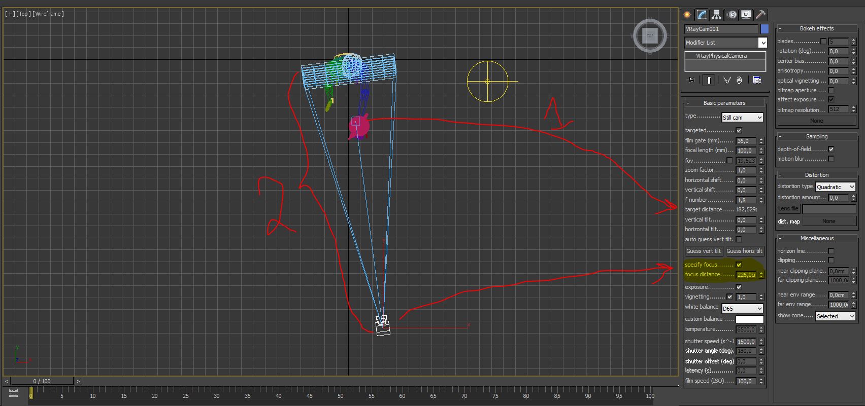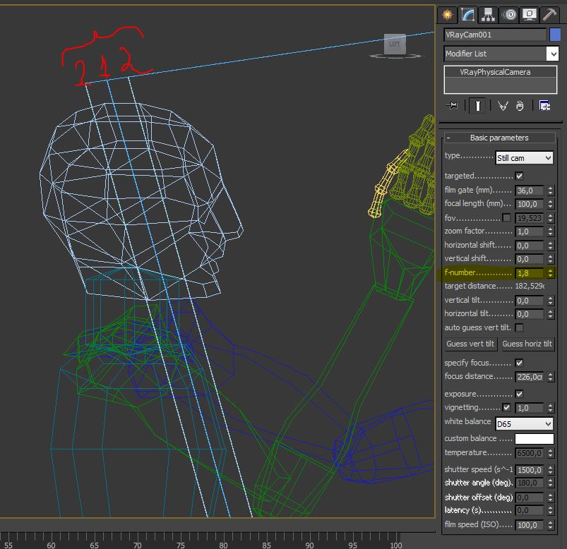 Ahora, si nos fijamos en la apertura (fstop), la cámara de vray tiene una manera bastante clara de decirnos qué zona estará en foco y a partir de que zona empieza a desenfocar.