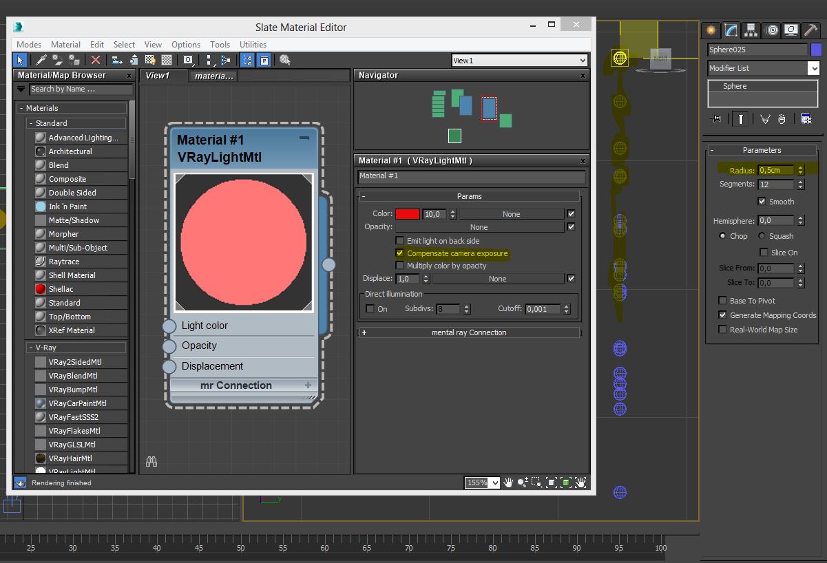 Las luces serán esferas de diensiones pequeñas (medio centímetro) con un material VrayLight Mtl con multiplicador 10 para mi caso. No olvidar activar la casilla «compensate camera exposure» para que la potencia del material no se opaque al ser vista por la cámara de Vray.