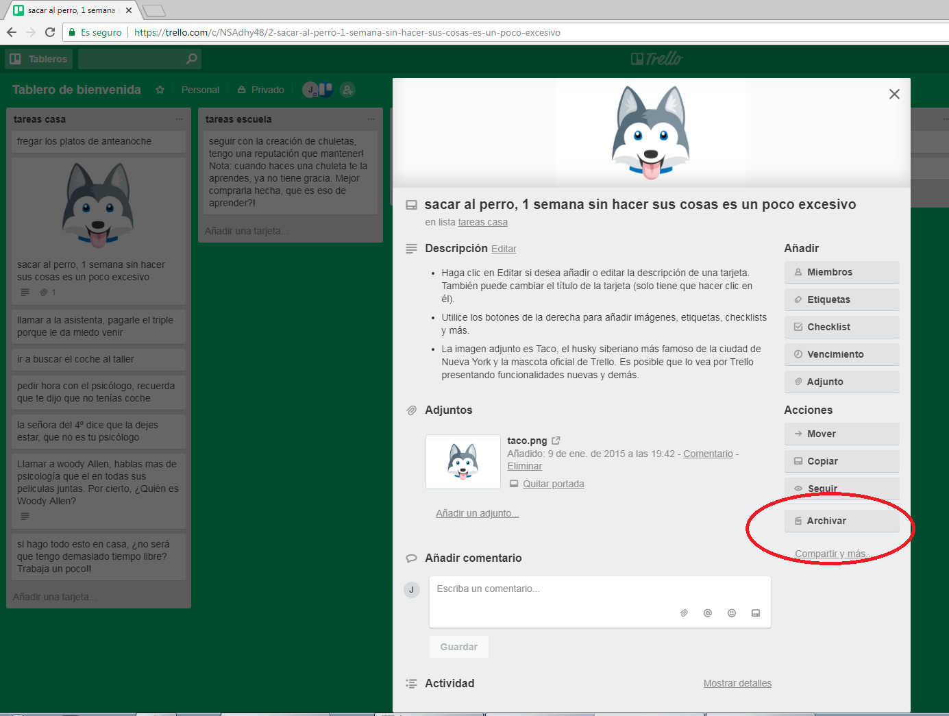 como puedes ver la idea es similar, la diferencia es que no hay columnas «en proceso-hecho». Todo está por hacer, y en el momento que terminas con una la archivas para no verla más. ¿Y cómo hacemos eso?