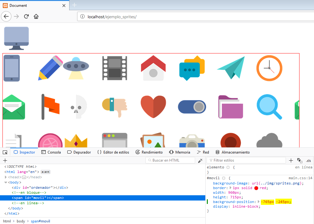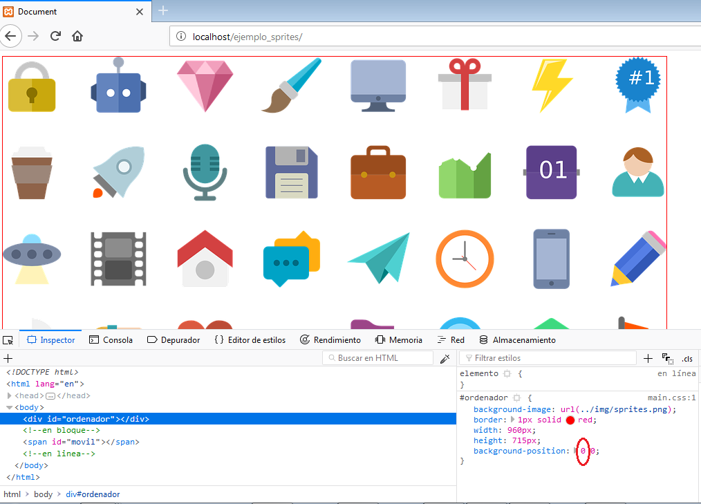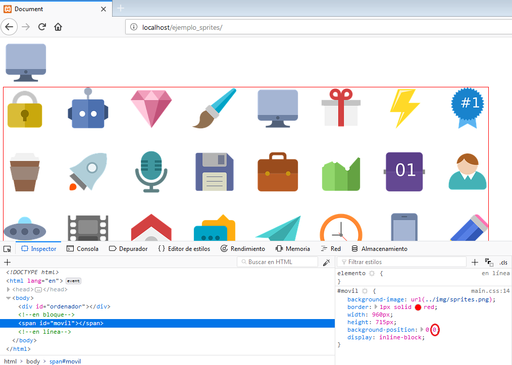 En el inspector nos aparecerá el código CSS de ese <div>. Situaremos el cursor encima de la primera coordenada (la horizontal) de la propiedad CSS background-position y con la tecla de la flecha hacia abajo, iremos desplazando hacia la izquierda el sprite, hasta colocar el icono del ordenador en el lateral izquierdo.