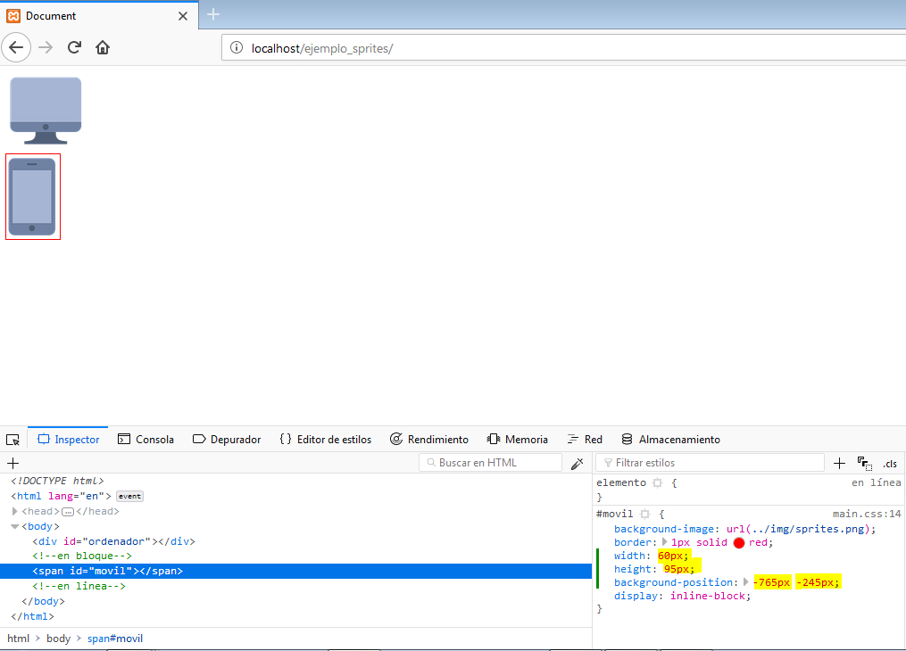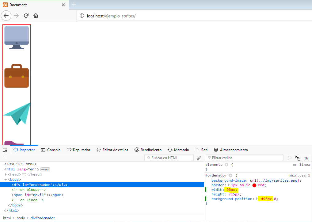 Como ya hemos dicho, nos interesa utilizar los sprites con css del ordenador y móvil. Vamos a empezar con el ordenador. Abrimos el Inspector de nuestro navegador y seleccionamos el elemento <div>.