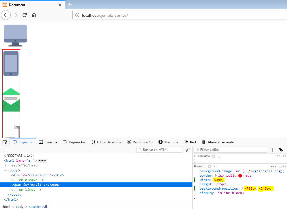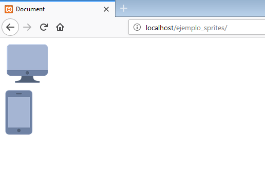Supongamos que de la imagen anterior (sprites.png) nos interesa usar el icono del ordenador y el del teléfono. Para ello tenemos que crear un par de elementos sin contenido. Lo recomendable es usar un <div> si queremos un elemento en bloque y un <span> si queremos un elemento en línea. En realidad podemos usar cualquier elemento, pero es recomendable usar uno de estos dos ya que no son elementos semánticos.