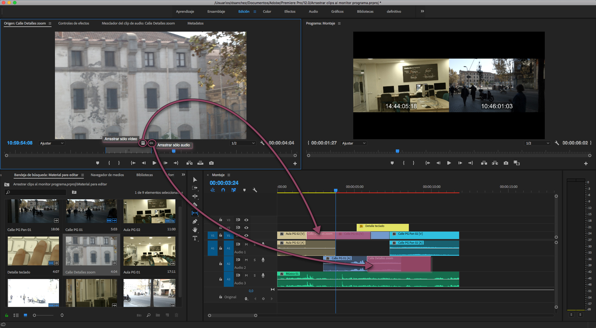 Cuando el clip está cargado en el monitor Origen, además se puede elegir si se quiere llevar a la Secuencia sólo el audio, o sólo el vídeo (obviamente, siempre y cuando que se trate de un clip del tipo Película, que contiene ambos medios).