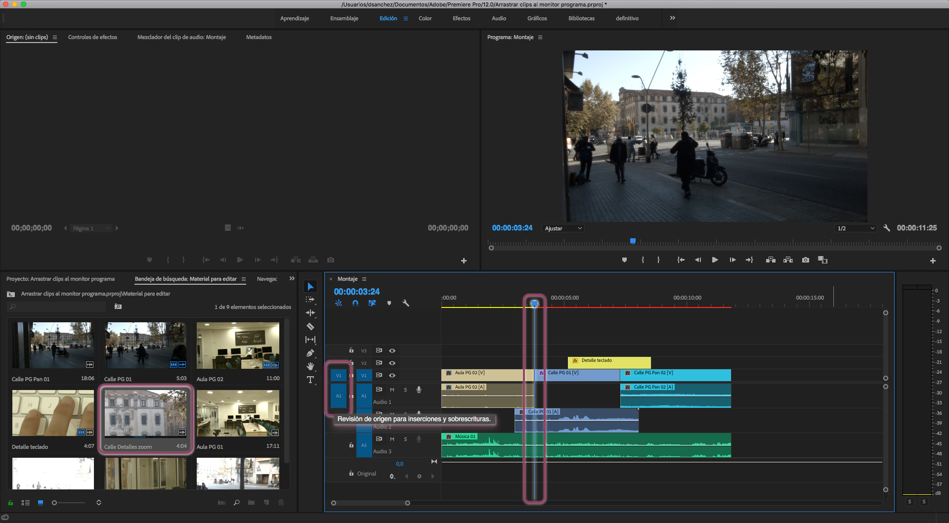 Si la barra de reproducción no está leyendo ningún clip (ni audio ni vídeo) en las pistas marcadas en la columna Revisión de origen para inserciones y sobrescrituras, no pasará nada, no habrá ningún cambio en la Secuencia pues no habrá sustitución alguna.