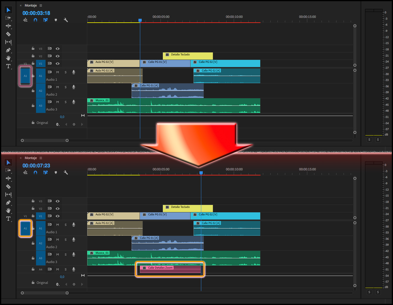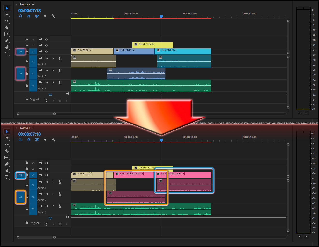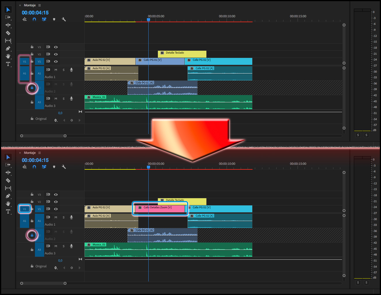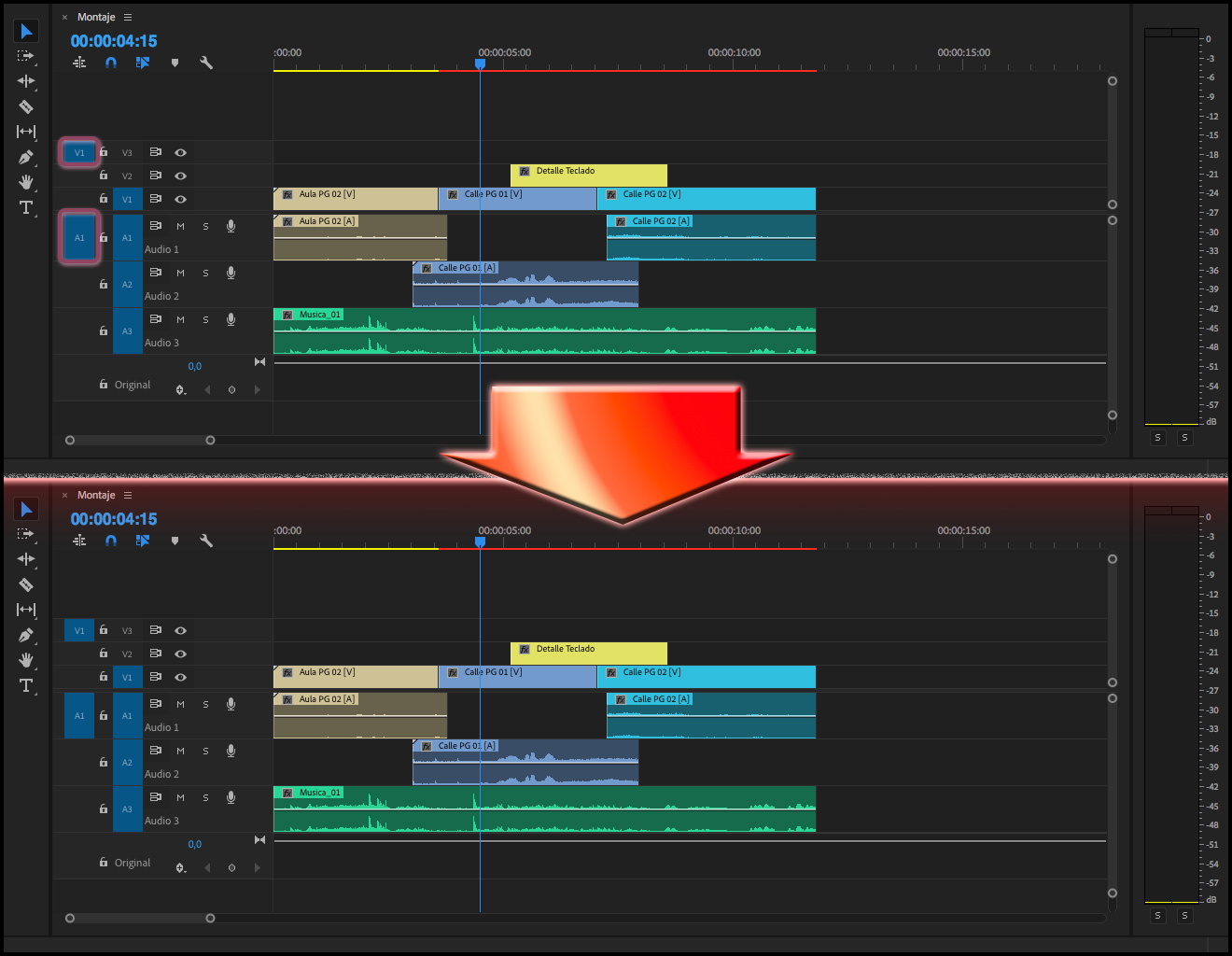 Hay que tener en cuenta que siempre se reemplazará todo el clip tal y como esté en la Secuencia, por ejemplo, en el caso de tener editado un clip del tipo Película (audio y vídeo), al que sólo se quisiera sustituir el vídeo, se reemplazará también el audio, por más que en la columna Revisión de origen para inserciones y sobrescrituras, la pista de audio esté vacía (como se puede apreciar en las dos imágenes de arriba). El único método para cambiar sólo el vídeo, sería bloqueando la pista donde está el audio del clip cuya imagen se quiere reemplazar.