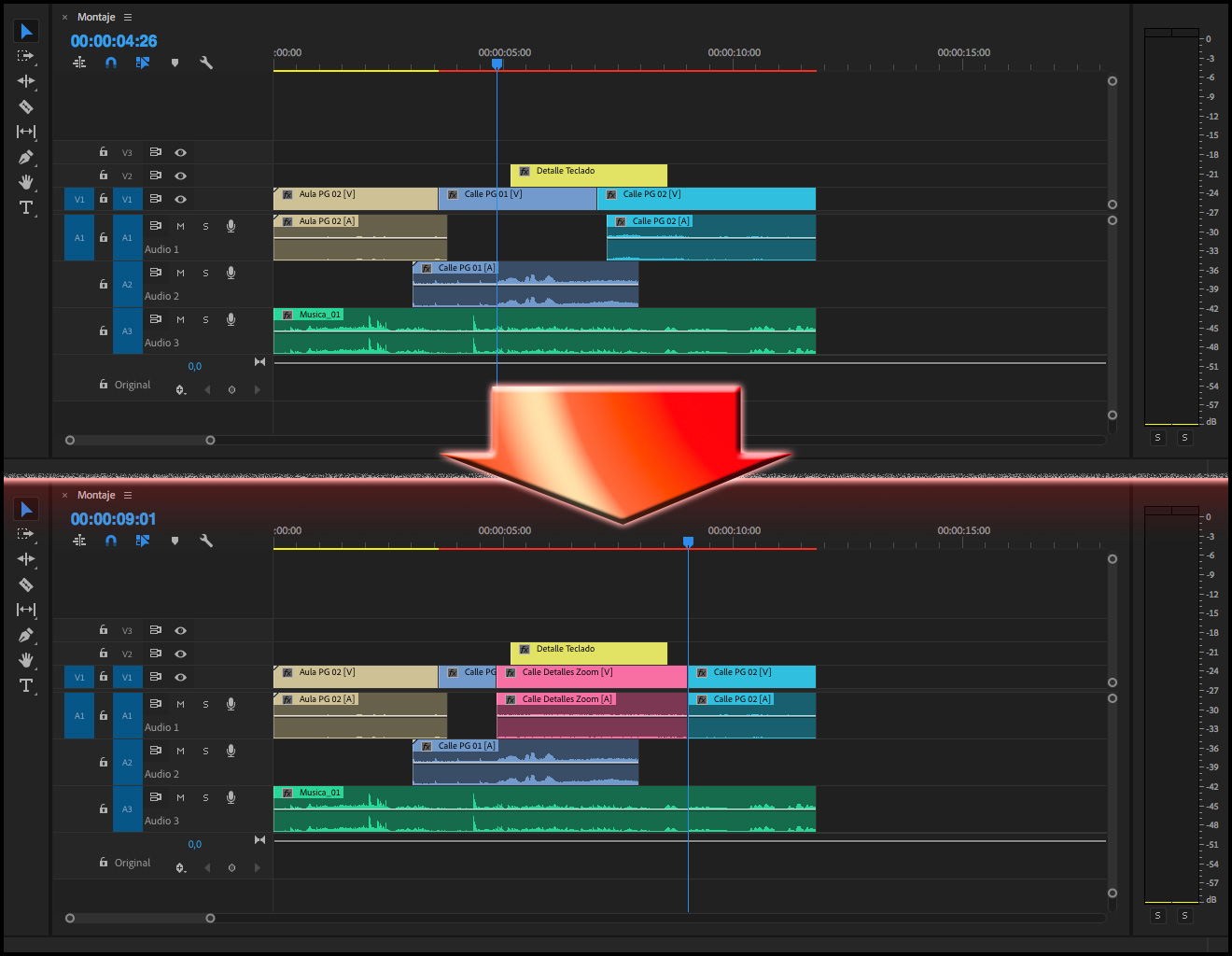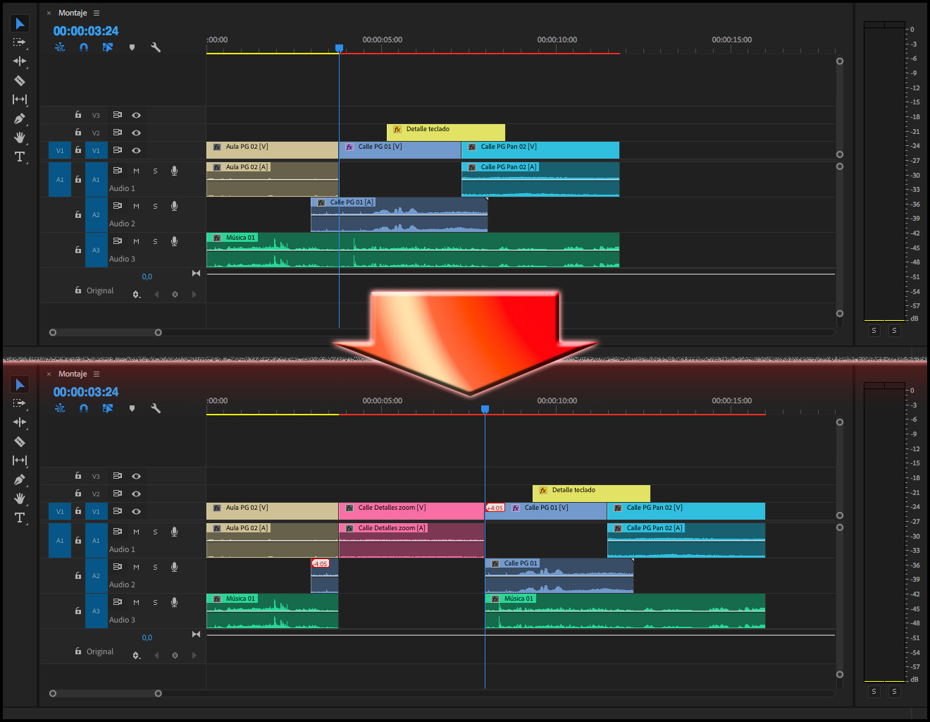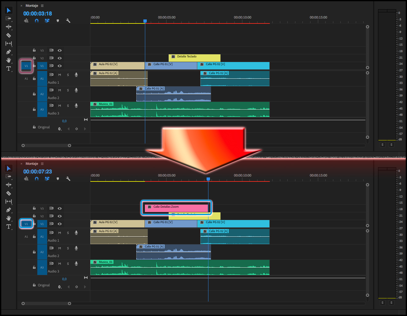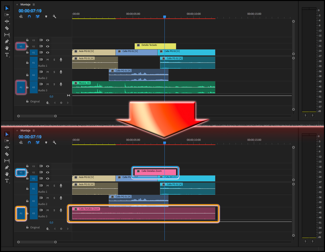 Hay que tener en cuenta que siempre se reemplazará todo el clip tal y como esté en la Secuencia, por ejemplo, en el caso de tener editado un clip del tipo Película (audio y vídeo), al que sólo se quisiera sustituir el vídeo, se reemplazará también el audio, por más que en la columna Revisión de origen para inserciones y sobrescrituras, la pista de audio esté vacía (como se puede apreciar en las dos imágenes de arriba). El único método para cambiar sólo el vídeo, sería bloqueando la pista donde está el audio del clip cuya imagen se quiere reemplazar.