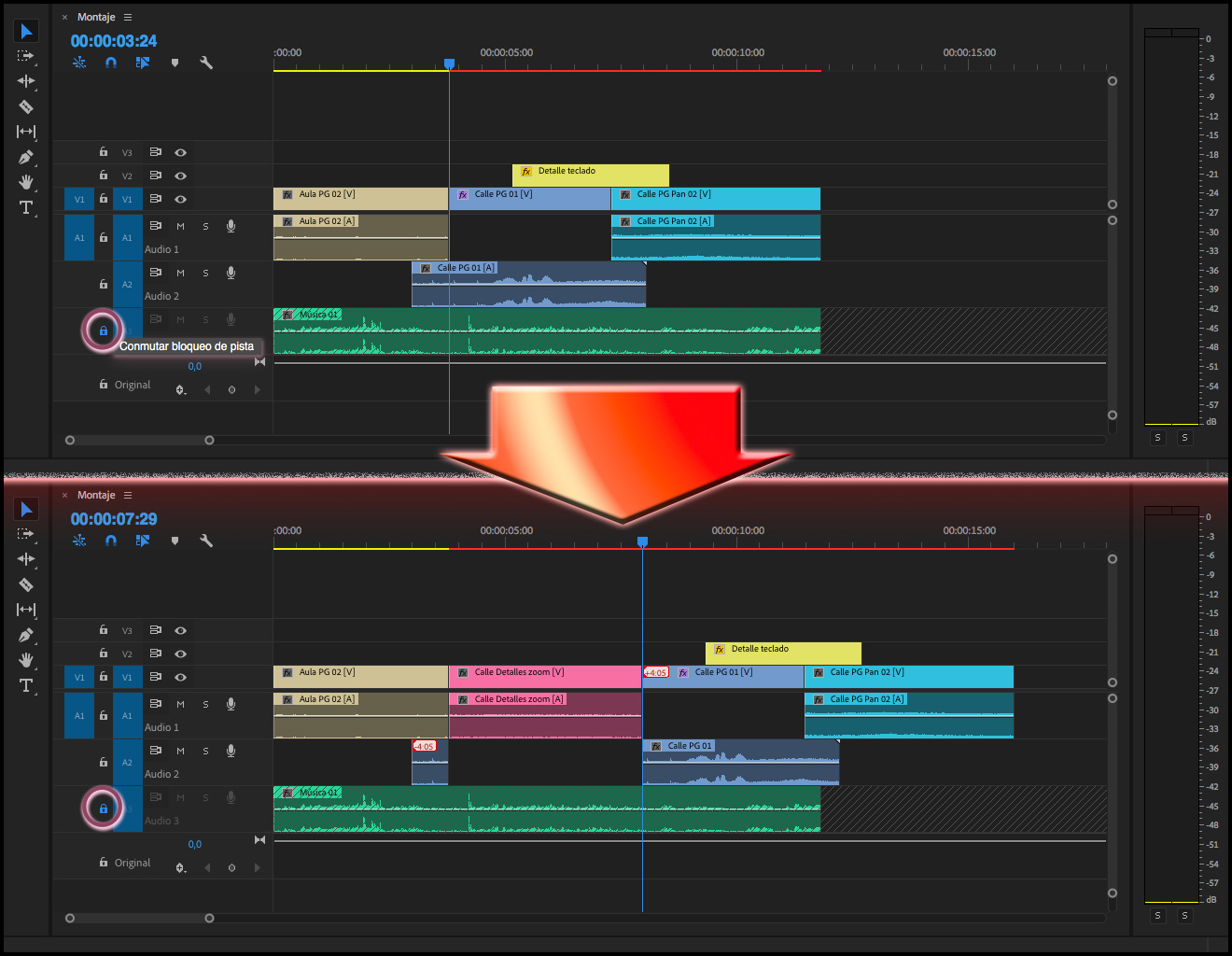 En las pistas bloqueadas, o donde se haya clicado el botón Conmutar el bloqueo de sincronización, no se producirá ningún desplazamiento al insertar.