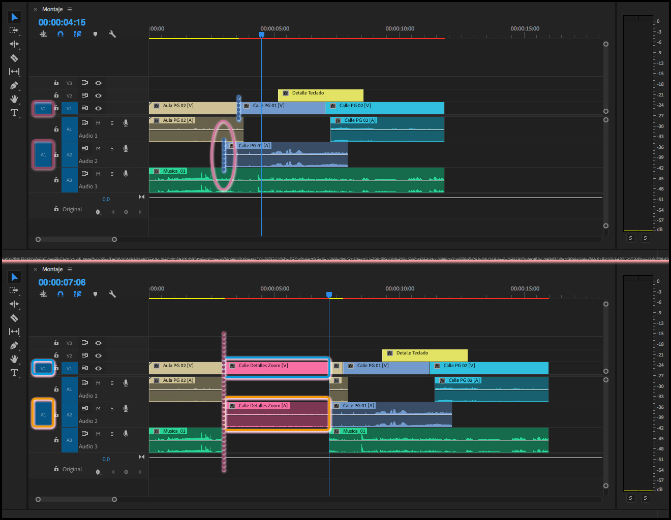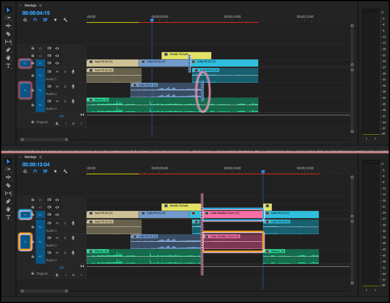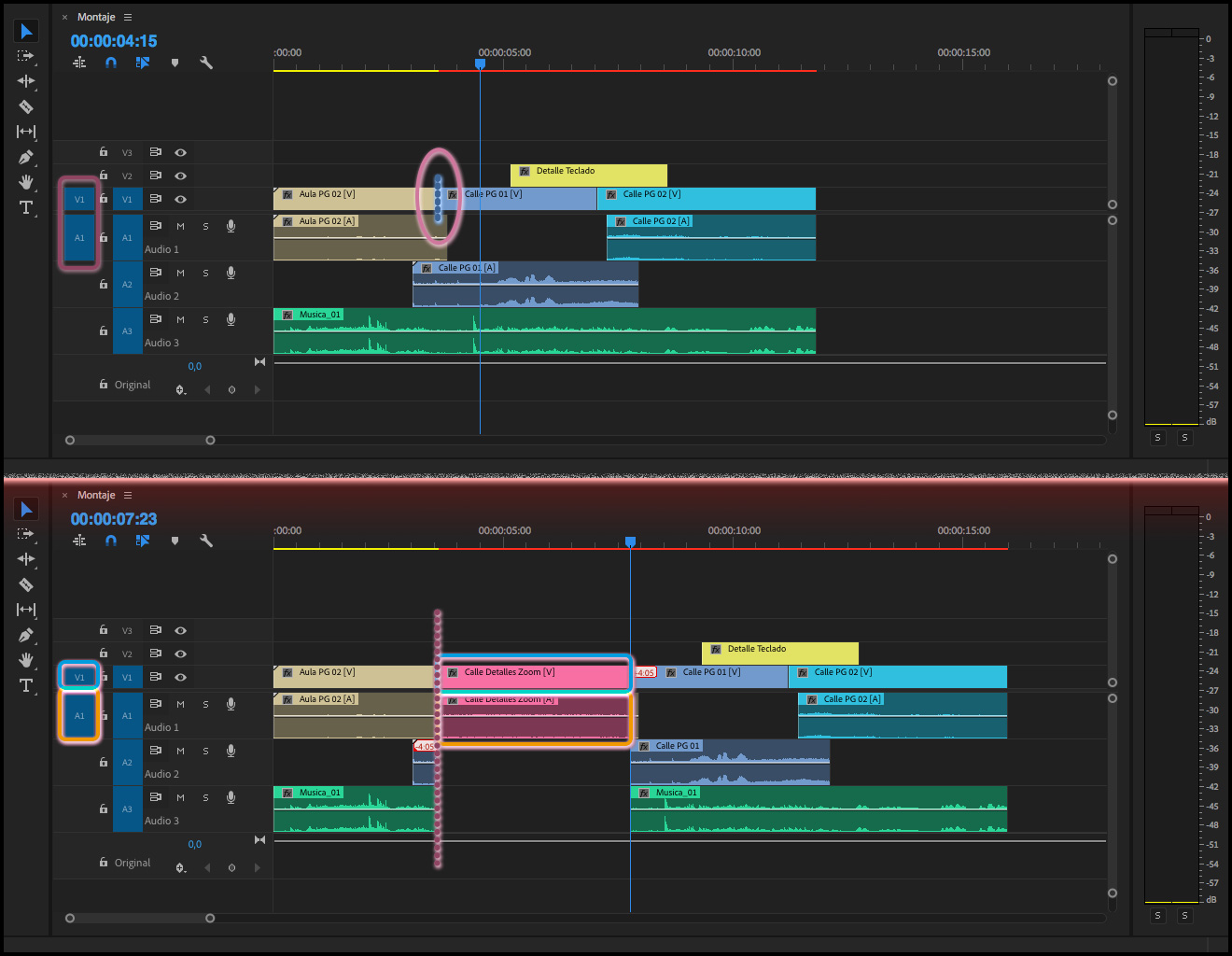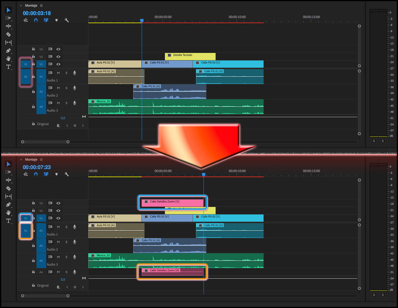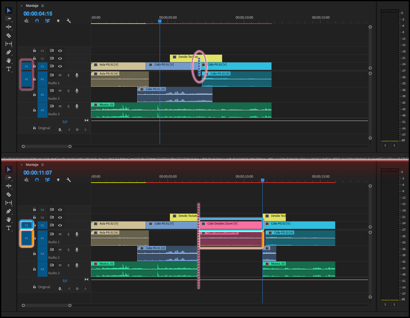 Y si  el clip, o clips, que se encuentre en las pistas marcadas en la columna Revisión de origen para inserciones y sobrescrituras, el audio y el vídeo no acaban a la par en el mismo punto:  Premiere toma el corte que caiga más a la derecha de los dos medios.