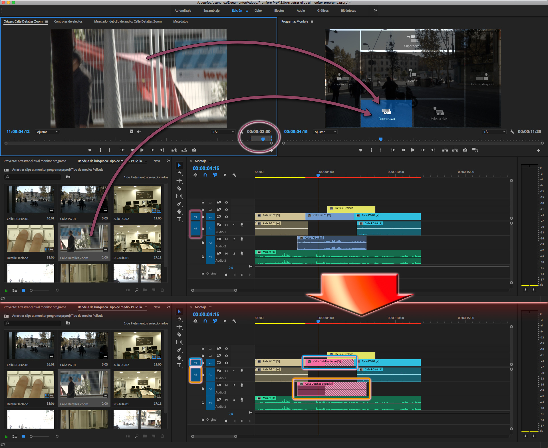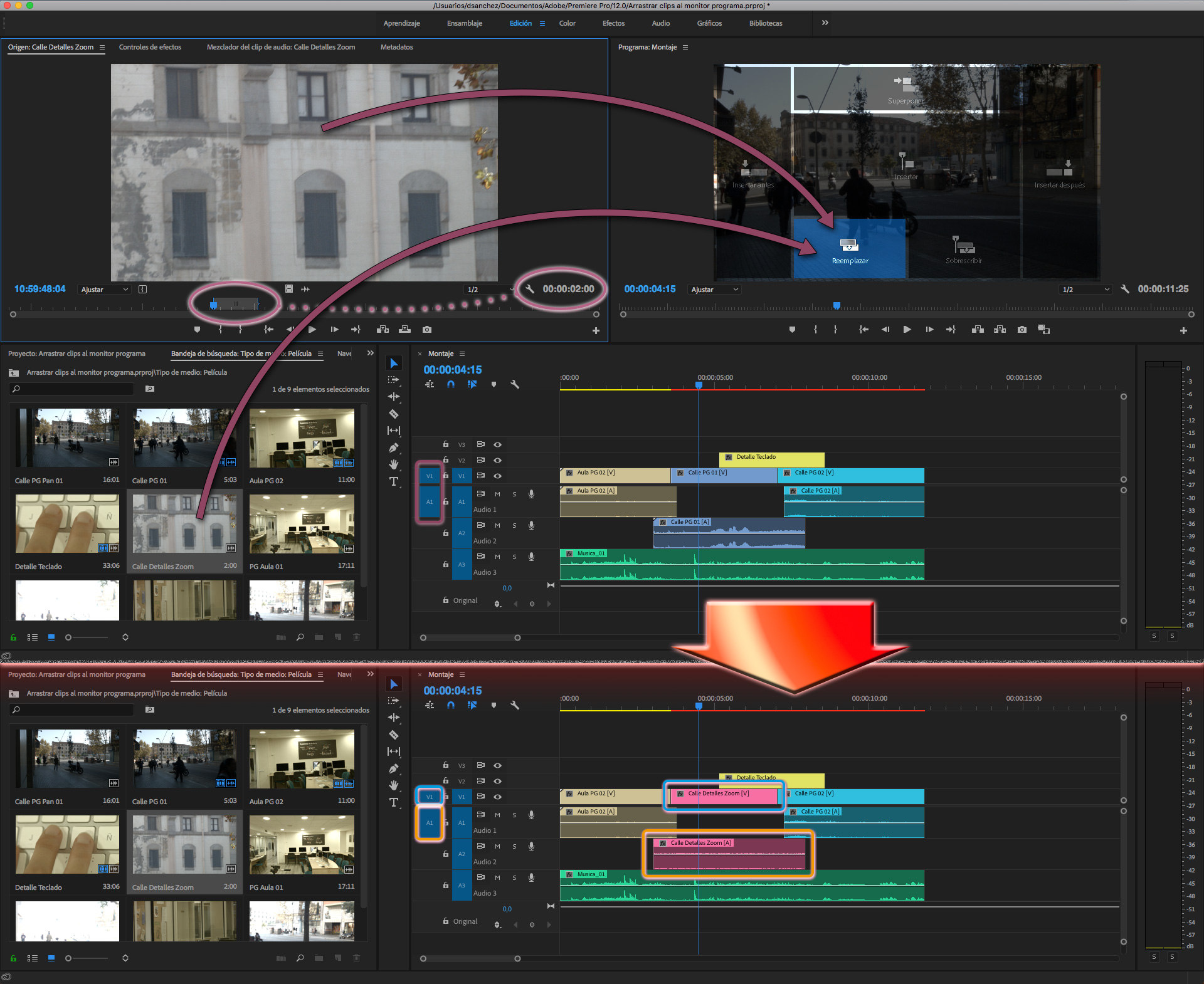 Reemplazar sustituye todo un clip ya editado en el montaje por el nuevo que se está arrastrando sobre esta opción del monitor Programa. Aunque en el fondo se trata de las opciones: Sustituir por clip desde monitor origen, o desde bandeja, que se encuentra en el menú Clip, o en el menú contextual cuando se clica sobre el clip editado con el botón derecho.