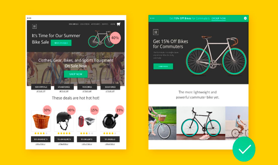 Antes de ver como crear una landing page, es importante estudiar sus diferencias con una página web para entender correctamente lo que es. A continuación, tenemos un ejemplo de página de inicio (a la izquierda) y de landing page (a la derecha):