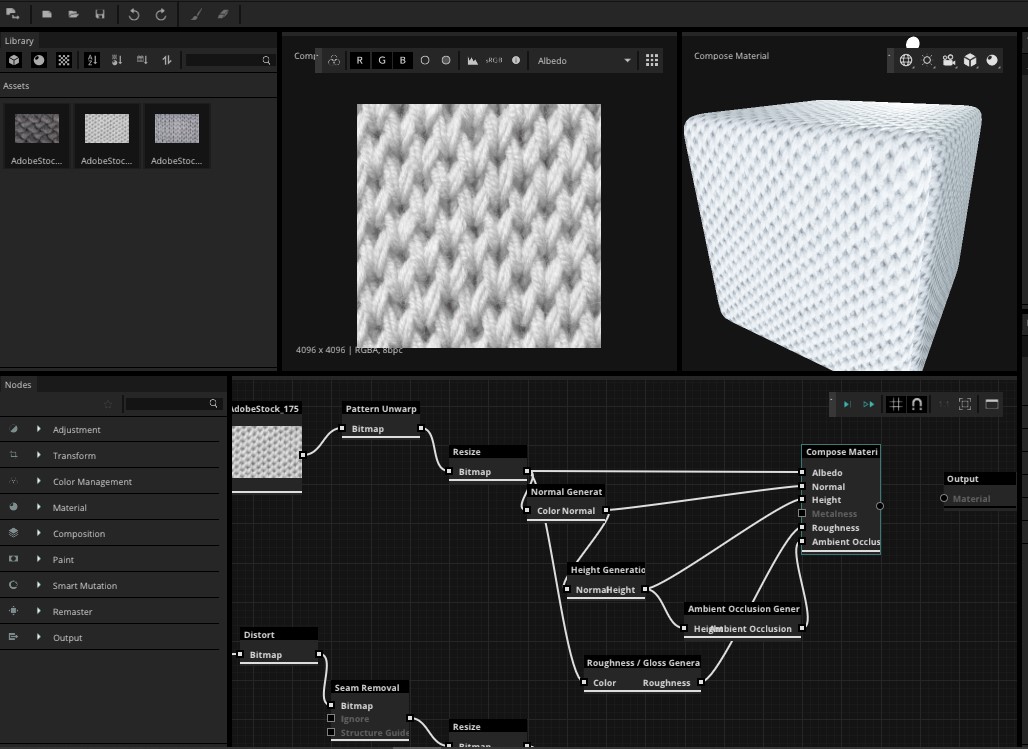 Permite re mezclar materiales ya creados para ofrecer alternativas más variadas a partir de lo que se posea ya en stock.  Combina todos los mapas y puede filtrarlos por atributos o por máscaras.