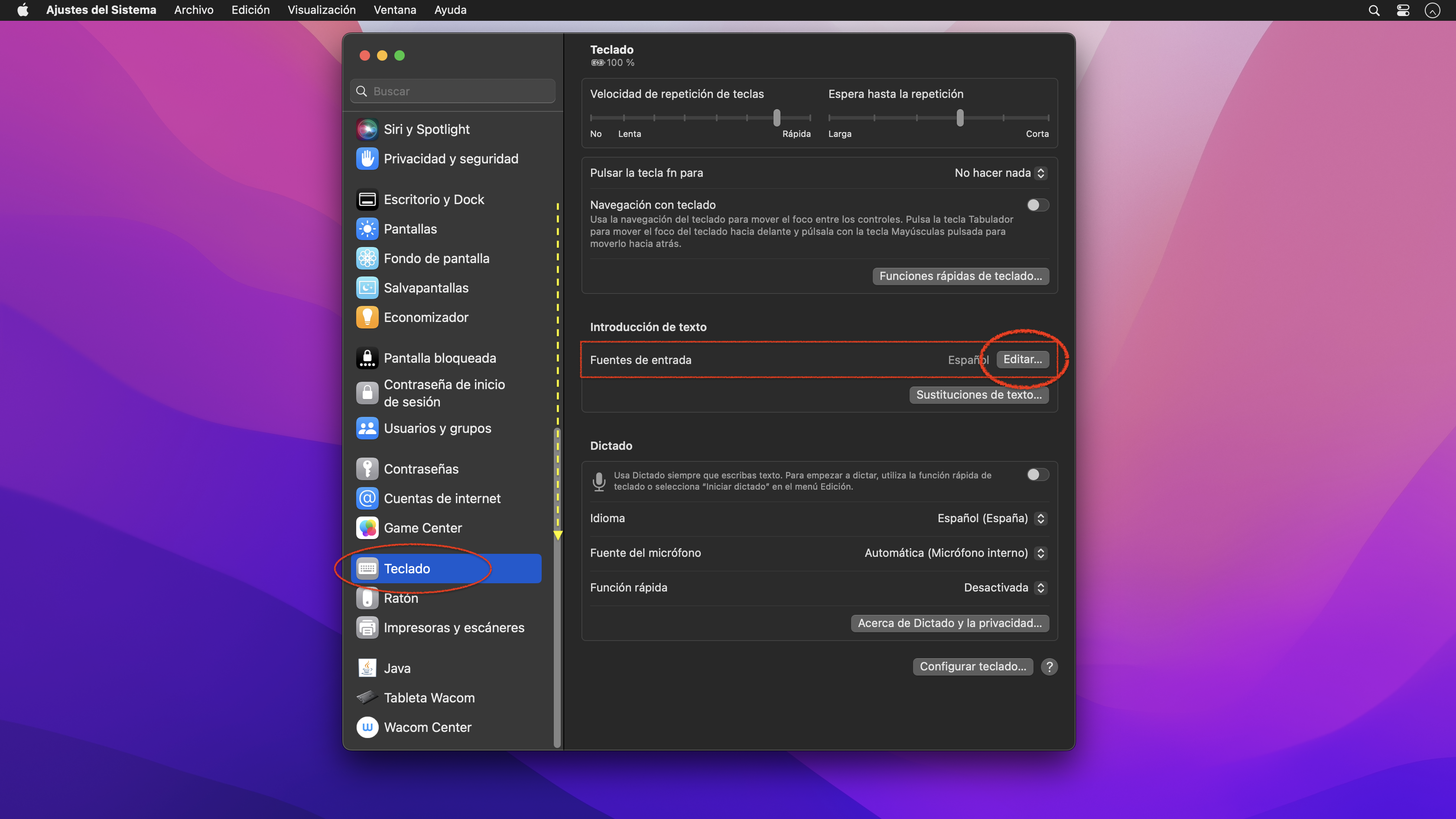 Se abre la venta de los ajustes, donde en la zona de la izquierda hay que buscar la sección Teclado (la cual se encuentra navegando hacia abajo). En el área principal del Teclado, hay que clicar el botón Editar de las Fuentes de entrada.