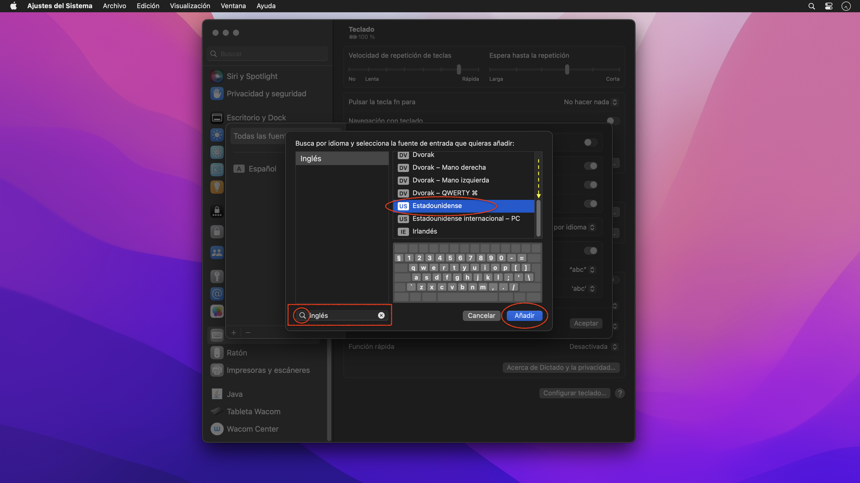 Clicar en el botón “+” para añadir una nueva Fuente de entrada, es decir, una nueva configuración de teclado. En el campo de búsqueda se escribe «Inglés», y de entre todos los teclados ingleses se escoge el Estadounidense.