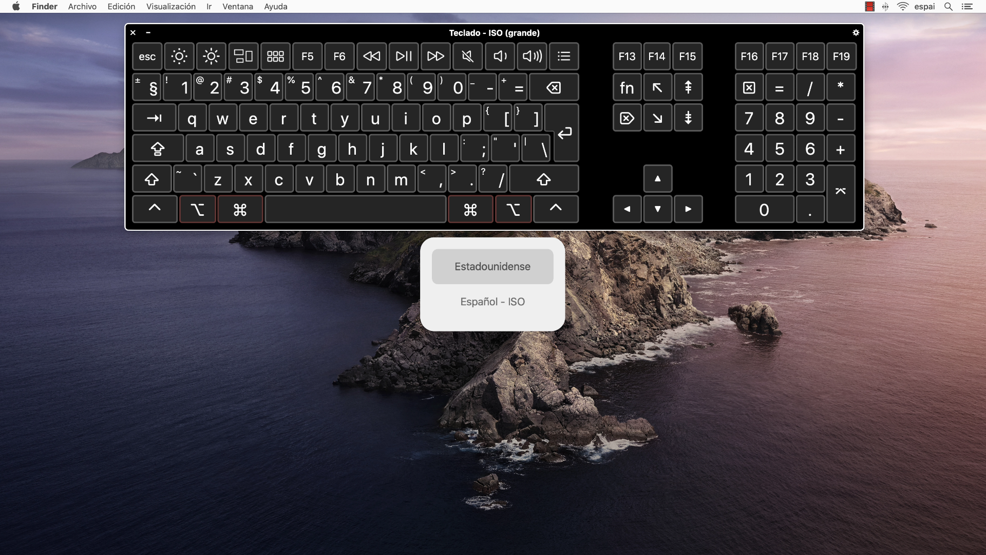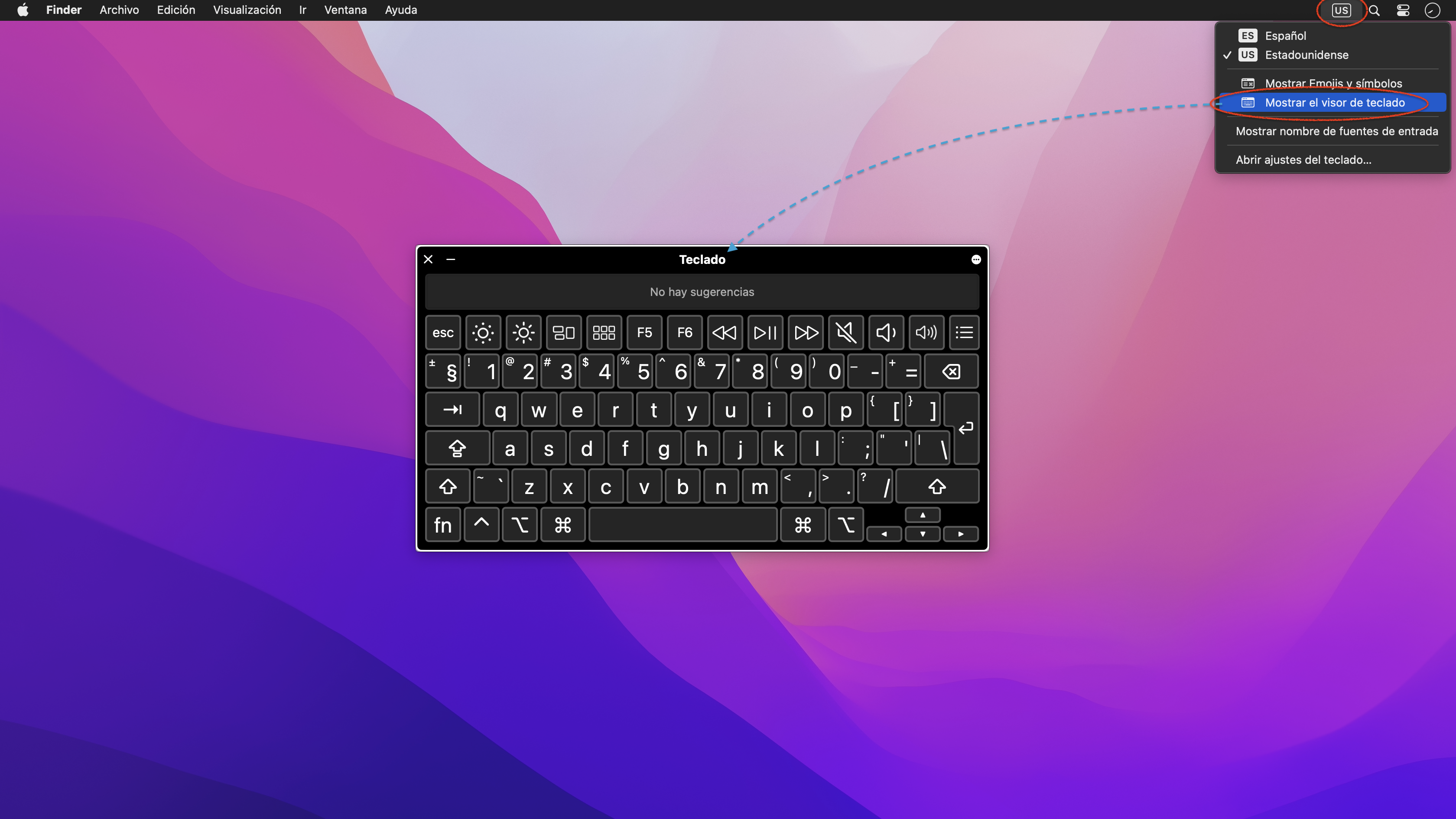Para saber qué teclas deben pulsarse para ejecutar los atajos correctamente, hay que hacer visible el Visor del teclado, y para ello hay que volver al icono de la barra de menús y escoger Mostrar el visor del teclado.