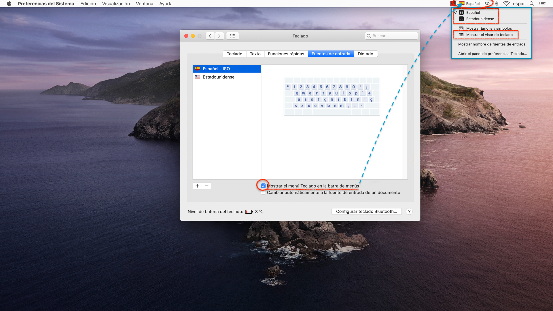 Recién añadida la nueva Fuente de entrada, se activará automáticamente la casilla Mostrar el menú Teclado en la barra de menús. Y desde la barra de menús se puede cambiar el idioma del teclado, así como Mostrar el visor del teclado.