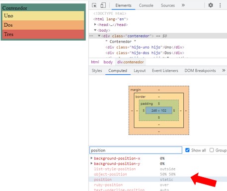 En el inspeccionar podemos averiguar cómo de forma predeterminada nuestra propiedad de posición se establece en estática, es la posición predeterminada en el flujo de un documento HTML.