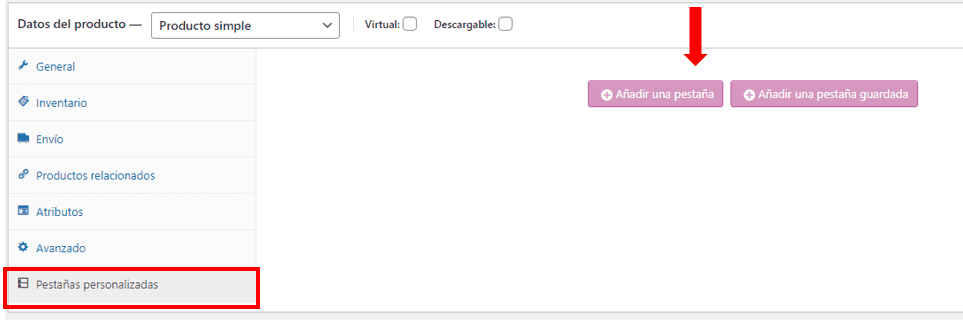 Mi recomendación si necesitas añadir pestañas a tus productos, es que uses Custom Product tabs para WooCommerce. Una vez instalado y activado en la barra lateral de tu wordpress verás un apartado de Pestañas de producto personalizadas.
