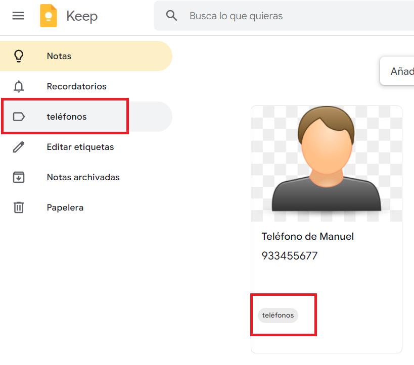 Una tarjeta puede contener varias etiquetas, o ninguna. Vamos añadir «teléfonos» a nuestra tarjeta: